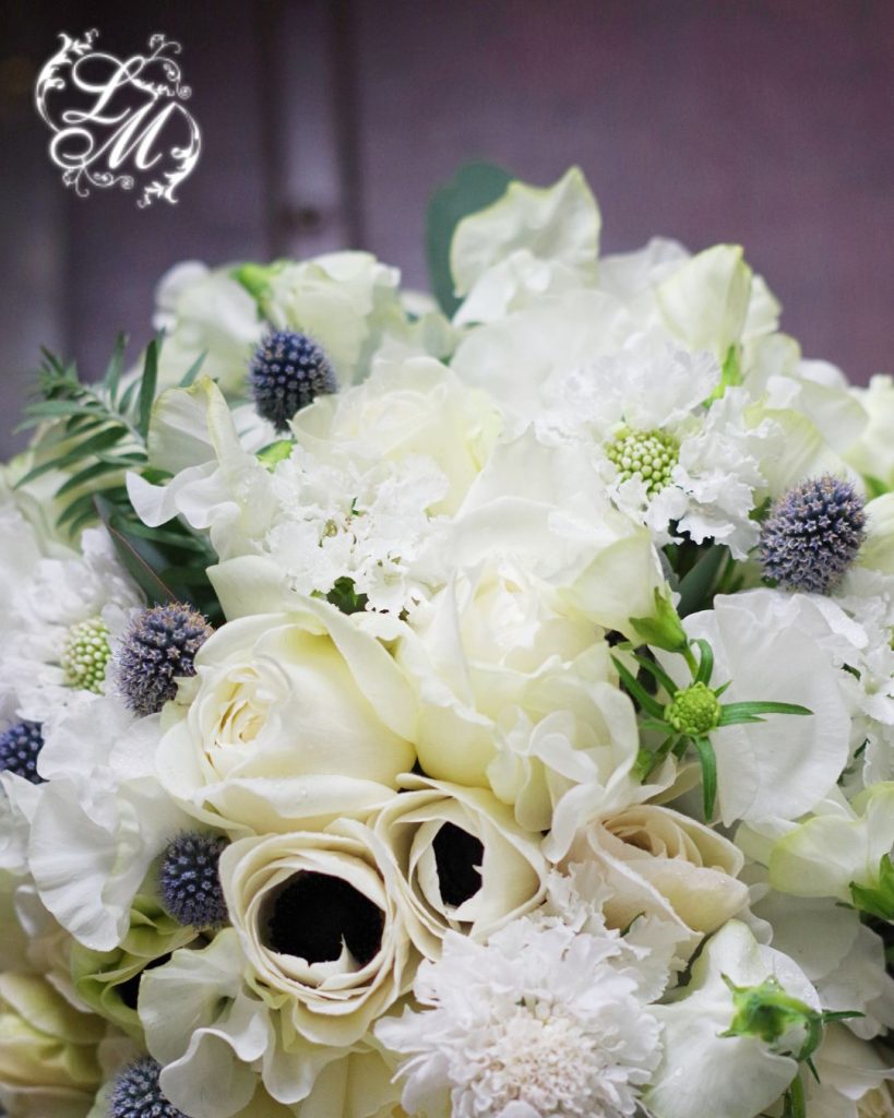 アッシュなグリーンのユーカリや、ふわふわのパンパスグラス、芯黒のアネモネなどを合わせると